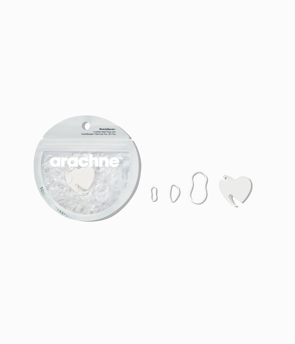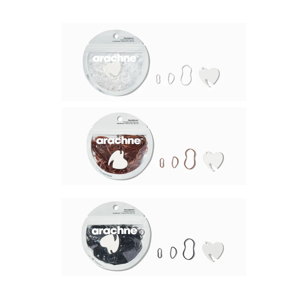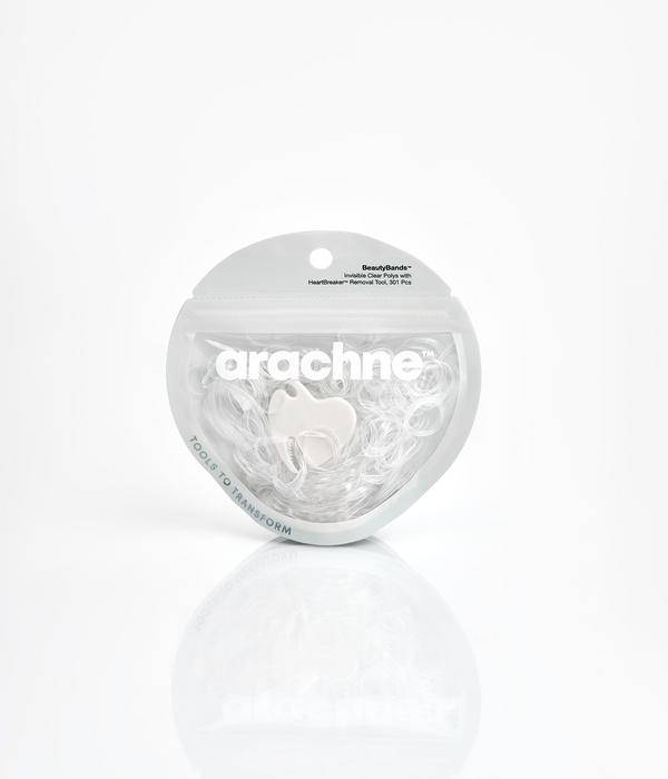 Introducing BeautyBands™, your go-to for secure, seamless styling. This 301-piece set includes invisible black poly bands designed to blend effortlessly into darker hair tones for a discreet hold. Paired with Arachne's innovative 2-in-1 HeartBreaker™ Removal Tool, these bands provide strong hold and easy removal. The tool’s hook side allows for reuse by pulling out the bands, while the serrated edge cuts through them when needed. Whether you’re styling a sleek ponytail or an intricate braid, these bands offer reliable hold and easy removal without damaging your hair.
