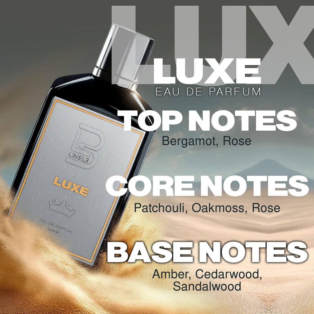 - Luxe: Luxe is a smooth, elegant Eau de Parfum built around fresh bergamot, soft rose, and warm woods. It opens clean and bright, settles into a refined mix of patchouli, oakmoss, and rose, then dries down to a comforting blend of amber, cedarwood, and sandalwood. The overall feel is polished, calm, and quietly confident.