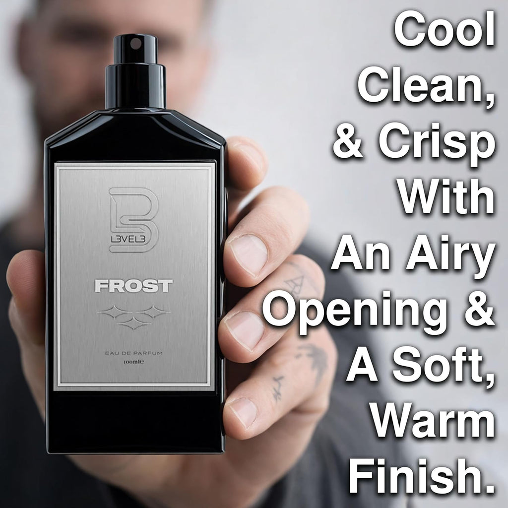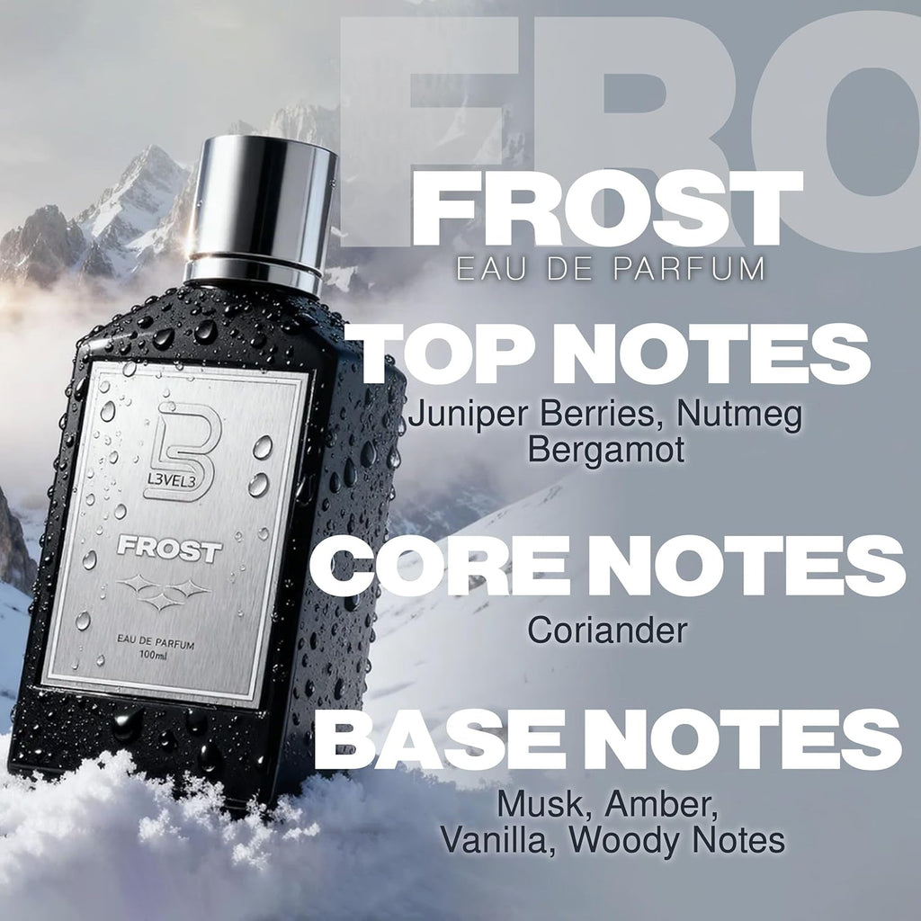 - Frost: Frost is a clean, cool Eau de Parfum with a crisp, airy opening and a soft, warm finish. It starts with bright juniper, nutmeg, and bergamot, then eases into a subtle coriander heart. The scent settles into smooth musk, amber, vanilla, and light woods, giving it a calm, focused feel that stays balanced all day.