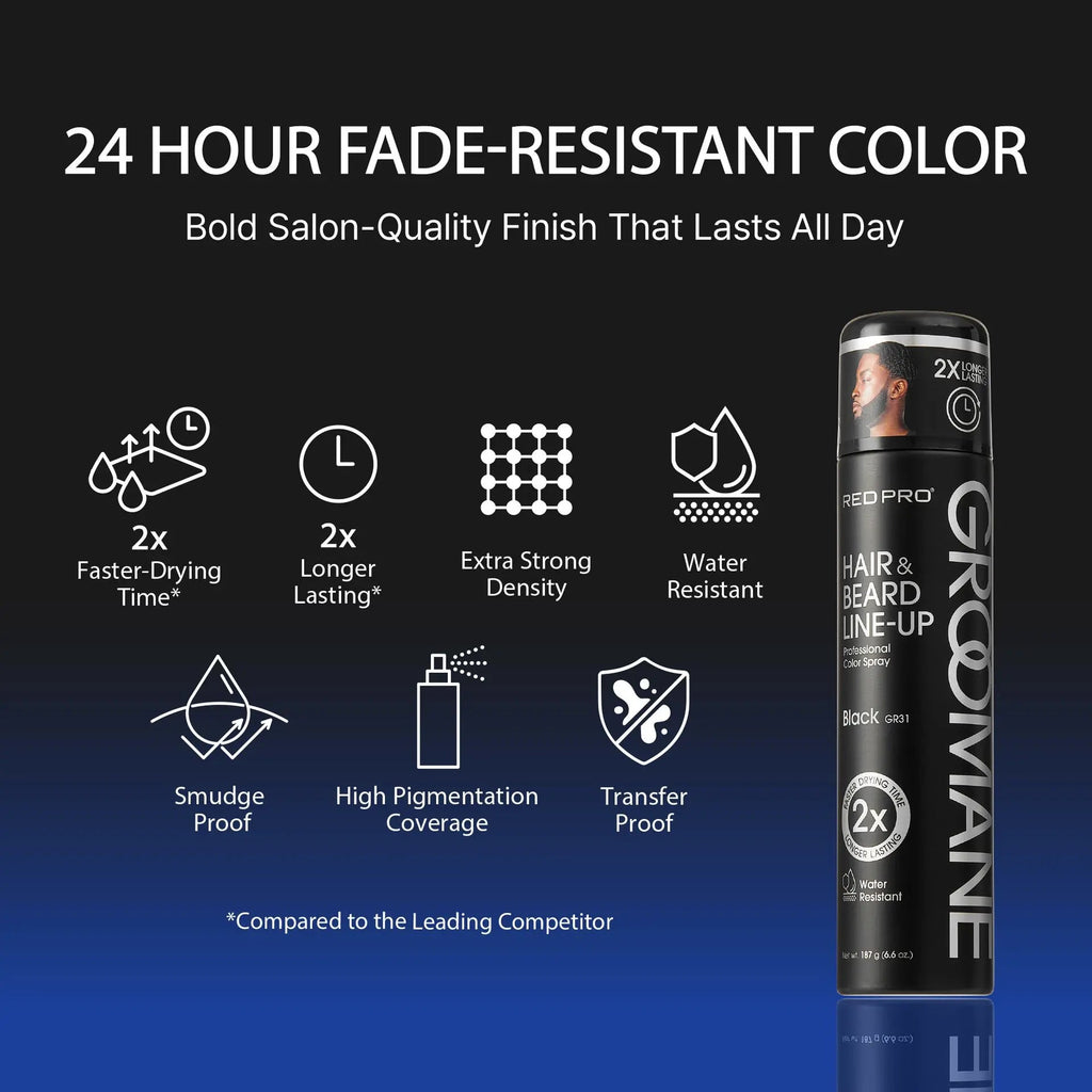 Groomane Professional Temporary Color Hair Spray covers grays and enhances the look of fuller hair and beards, and sharper lineups. This 24-hour fade-resistant professional-grade, formula dries in 30 seconds.