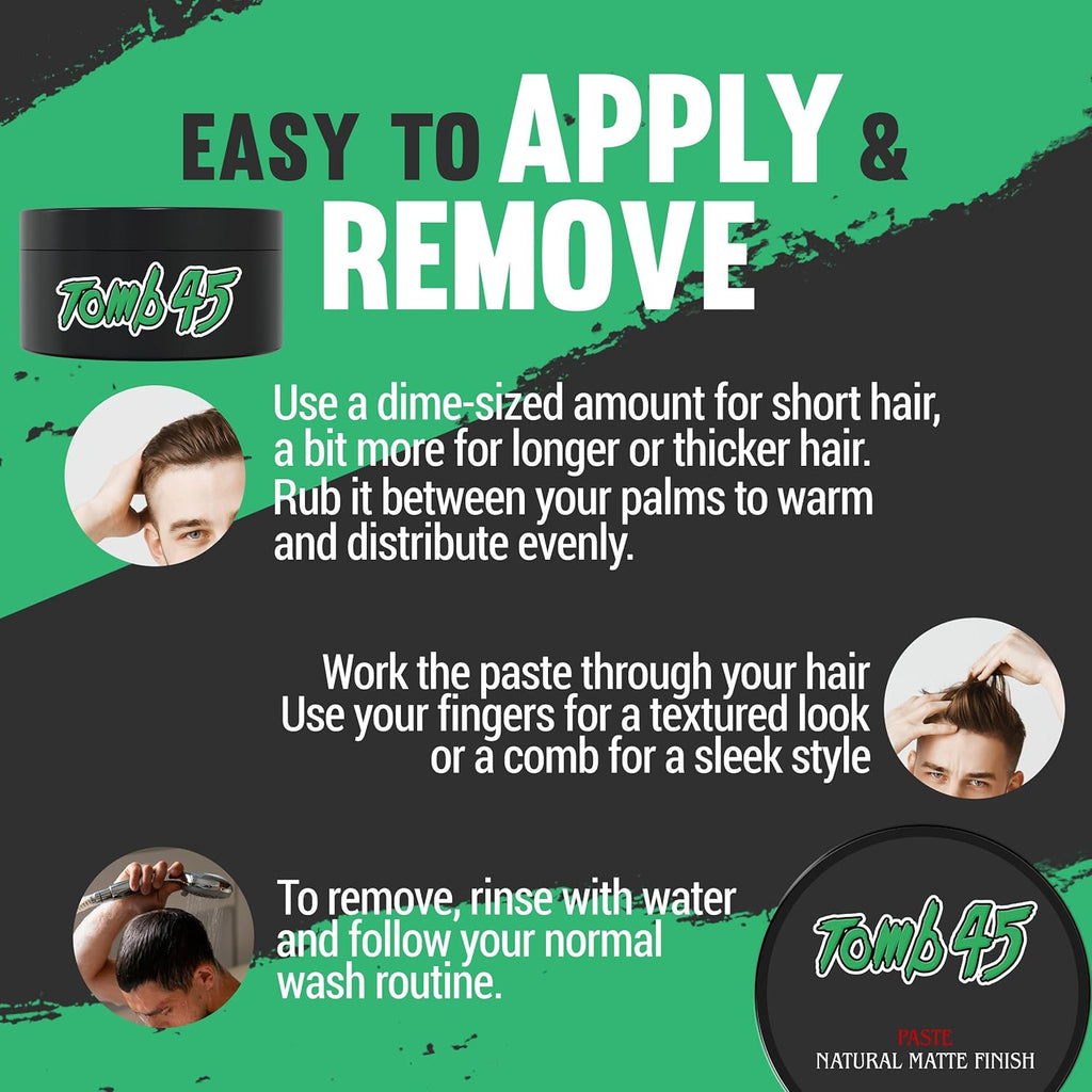 Tomb45® Styling Paste is the ultimate hairstyling solution for those seeking a natural, textured look with all-day control. Its lightweight, creamy formula offers a medium hold and a low-shine, matte finish, making it perfect for versatile, everyday styles. Easy to apply and work through hair, the Tomb45 Paste delivers professional-quality results for all hair types, providing effortless style with a clean, natural appearance.