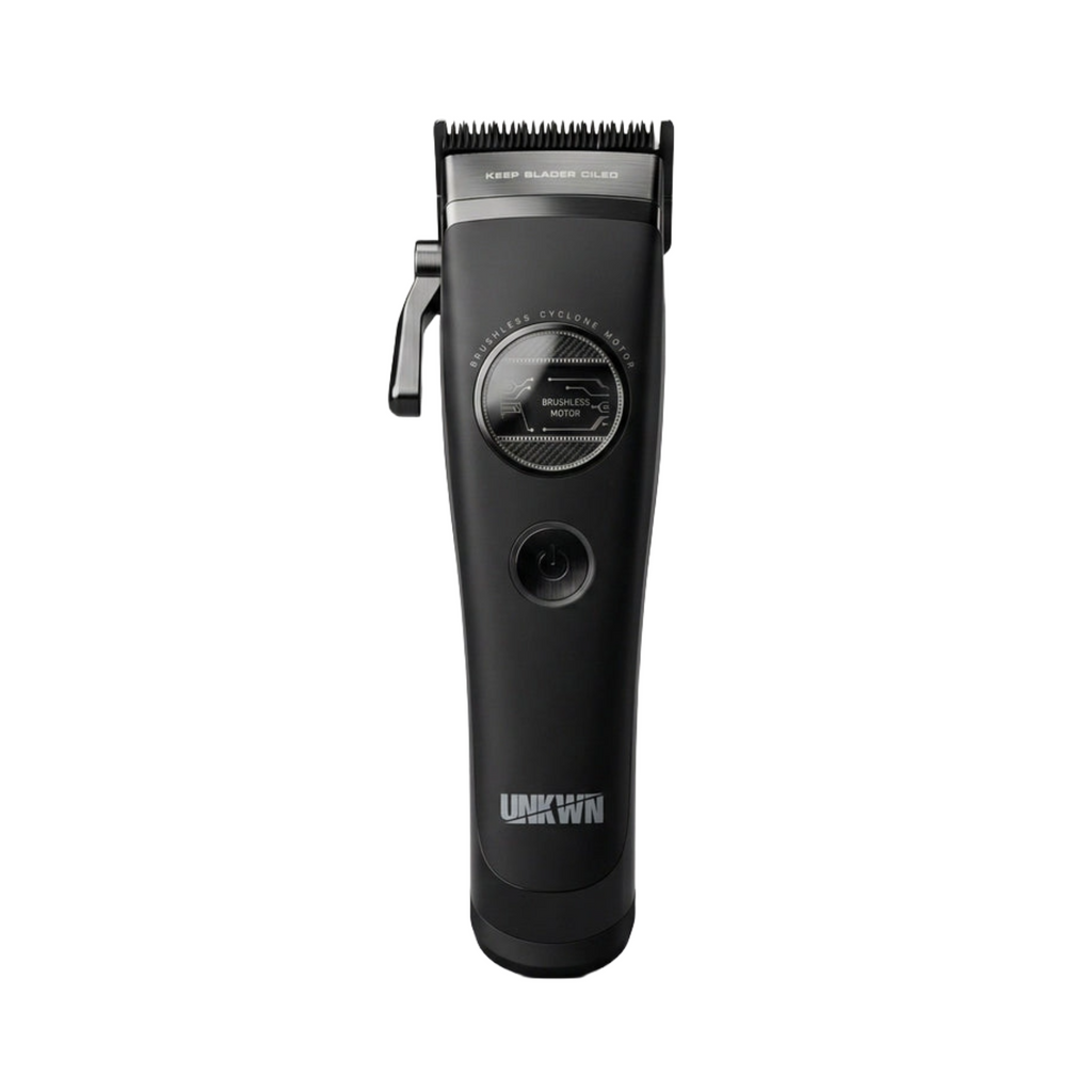 The UNKWN Cyclone Clipper is a professional cordless hair clipper built for barbers who demand powerful cutting performance without excessive noise. Featuring a signature visible motor window, this clipper showcases the High Torque Ultra Quiet Cyclone Motor, engineered to deliver massive torque with whisper-quiet operation under 65dB.