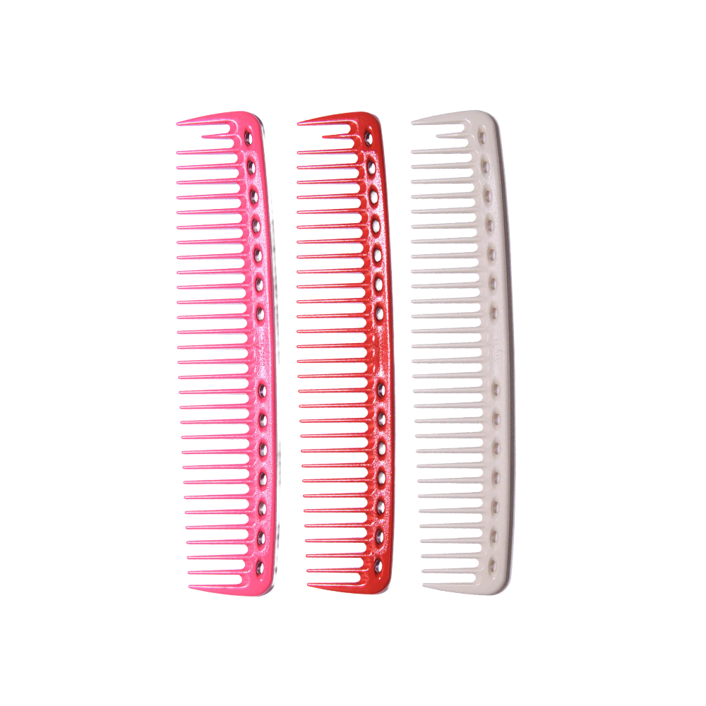 The smooth and strong YS-402 Cutting Comb 7.5" is a comb designed with larger teeth and wider spaces between them. Includes air holes along the body to enhance the flexible and lightweight properties of the surgical-grade plastic. The dimpled handle provides an organic feel and an easy grip that wont slip when you need it most. Engineered with gradually decreasing pitch, where the spacing between each tooth is gradually narrowed by 10 microns to facilitate even tension on the hair through every stroke.
